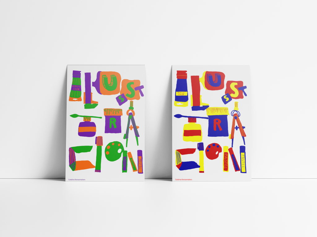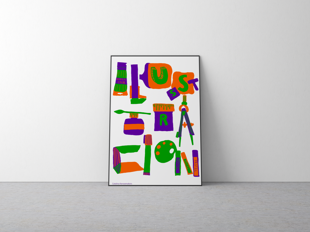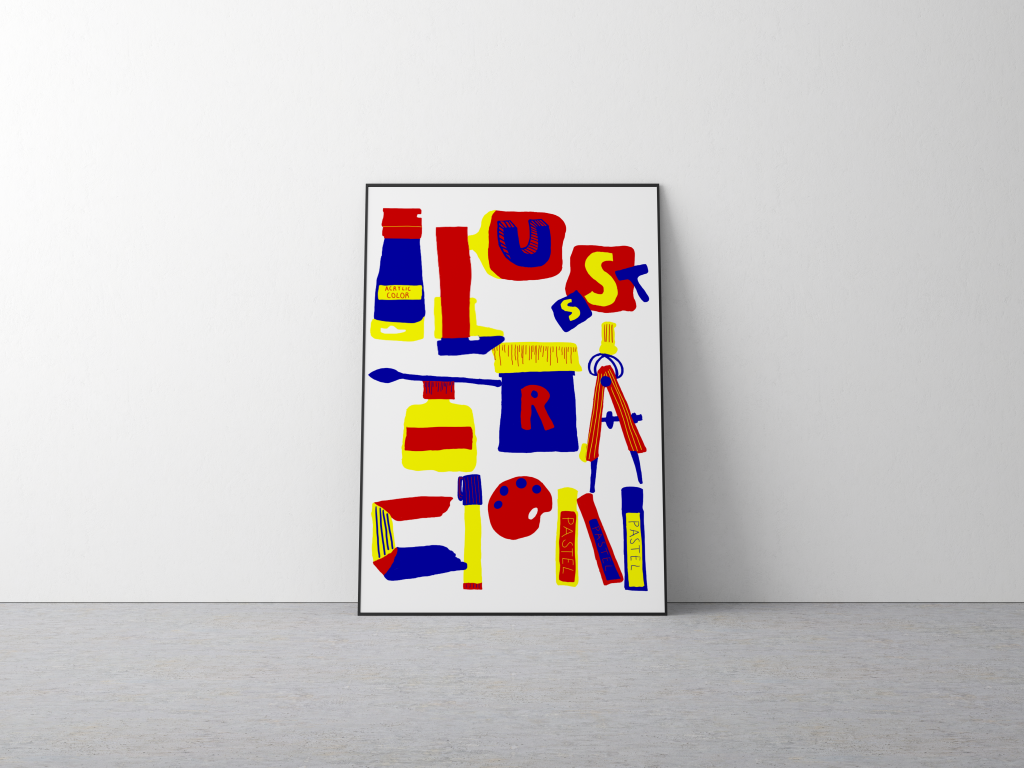 Cada letra fue construida con formas y objetos propios del mundo artístico, combinando composición, color y textura para lograr una tipografía expresiva y lúdica que comunica visualmente el acto de ilustrar.
