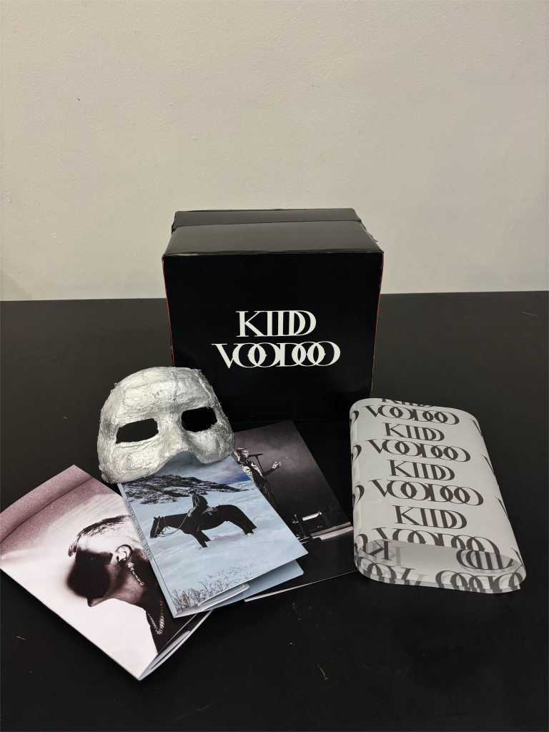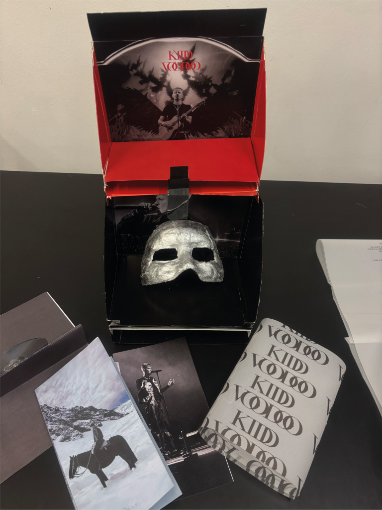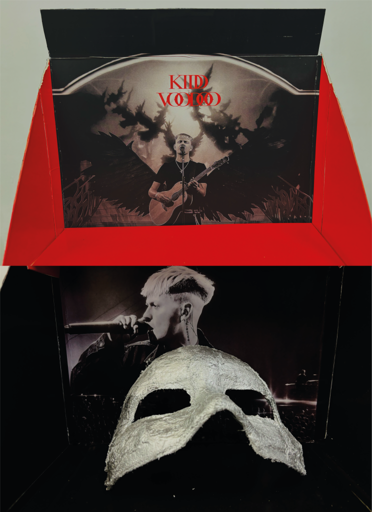 Este proyecto de packaging fue se hizo en torno al artista Kidd Voodoo, buscando transmitir su estética oscura y auténtica a través de un set box. La propuesta integra elementos gráficos minimalistas en blanco y negro con destellos de color saturado, tipografía gótica y recursos fotográficos, creando una experiencia tangible que conecta emocionalmente con los fans. El diseño no solo funciona como contenedor de productos exclusivos (máscara, polera, CDs, cámara analógica), sino también como un objeto de exhibición y recuerdo, reflejando el misterio, la teatralidad y la identidad visual de Kidd Voodoo.